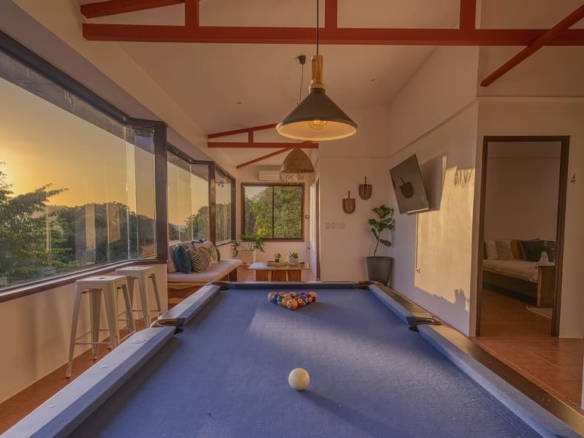 The Villa is equipped with a hot tub, an infinity pool, a pool table, a basketball net, an indoor and outdoor kitchen, an exterior projector that displays 150 inch on the wall with a Roku sound bar.